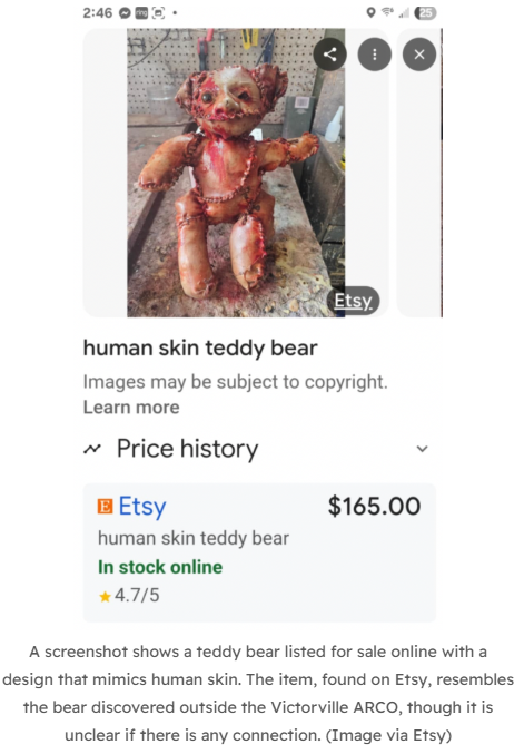 En un tranquilo día en Victorville, California, un hallazgo perturbador captó la atención de los transeúntes y desató una movilización policial: un oso de peluche aparentemente cubierto de «piel humana» fue encontrado afuera de una tienda de conveniencia AMPM.
