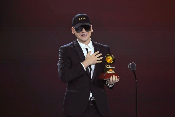 Bizarrap acepta el premio a la Mejor canción urbana en el escenario durante la ceremonia de estreno de la 24ª Entrega Anual del Latin Grammy.