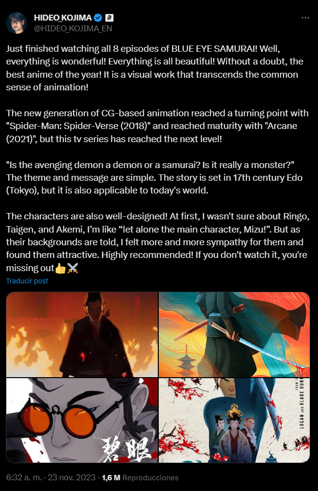 En su Twitter, Hideo Kojima, el famoso creador de Metal Gear y Death Stranding, dejó grandes elogios para el anime Blue Eye Samurai que se estrenó el pasado 3 de noviembre en Netflix. Incluso llega a afirmar que es el mejor anime de 2023.