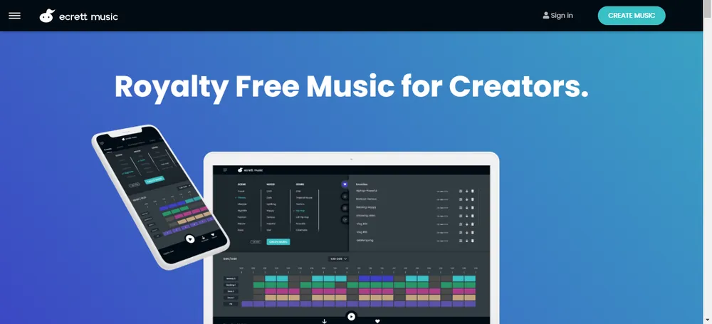 Otro generador de música que no cobra regalías es Ecrett Music (https://ecrettmusic.com/). Para empezar la producción, debes seleccionar algunas características para tu melodía, como «fantasía», «techno» o «slow». Luego, la plataforma mostrará un resultado que combina todas las opciones seleccionadas.