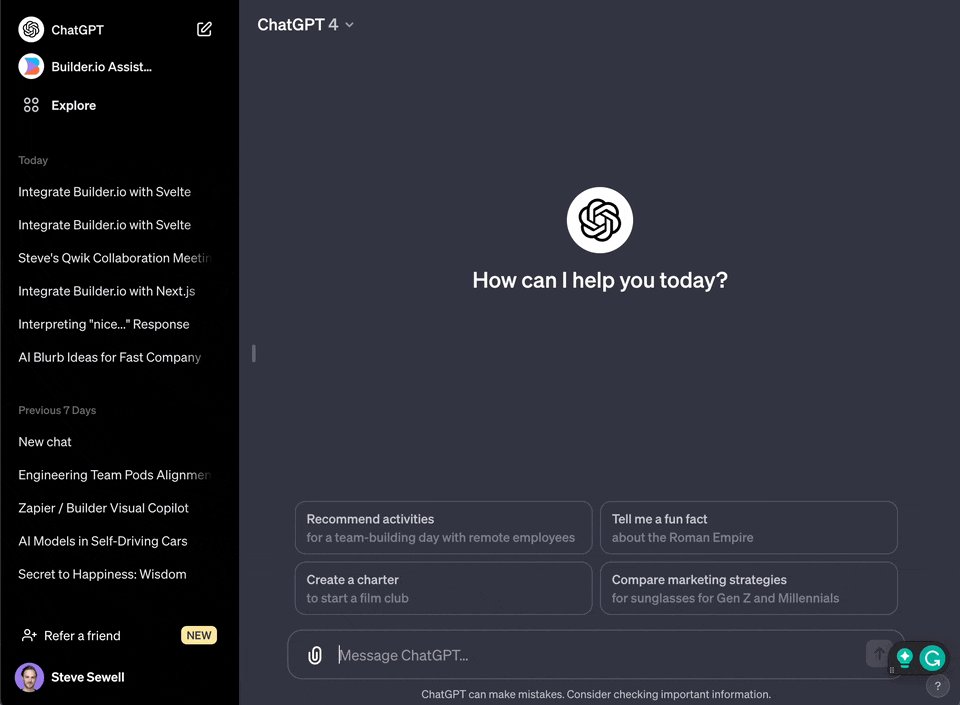 Interactúa con ChatGPT de manera conversacional para sentar las bases de su GPT. Antes de sumergirse en las instrucciones personalizadas en la pestaña «Configurar», ten una charla informal para describir lo que imagina. Esta interacción inicial sirve como base para el borrador de su GPT.