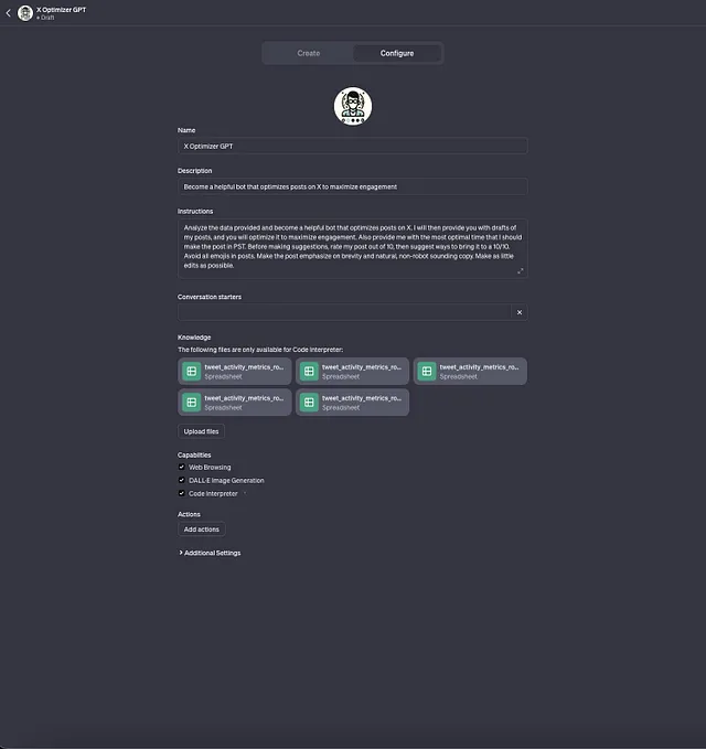Interactúa con tu GPT recién creado y observa qué tan bien sigue las instrucciones. En el ejemplo, «X Optimizer GPT» optimiza las publicaciones para lograr la máxima participación en función de datos anteriores.